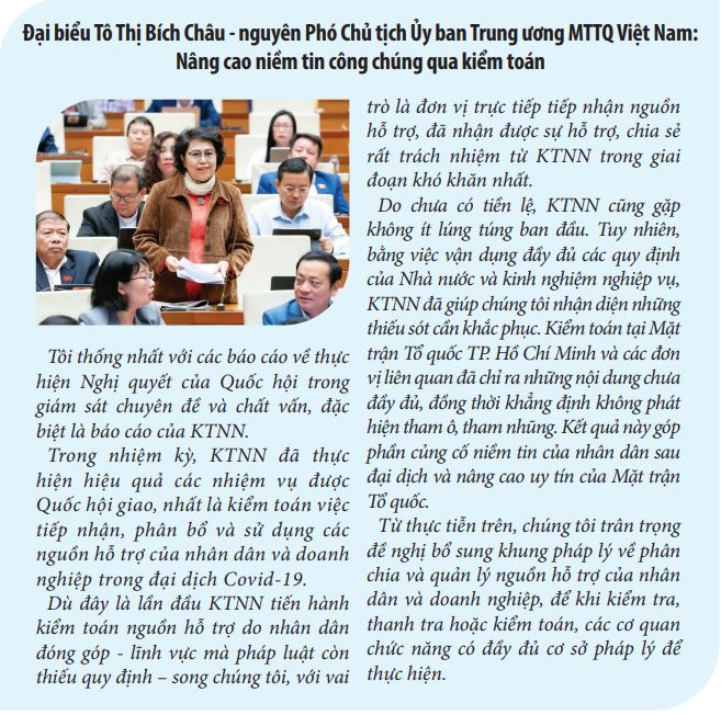 Đại biểu Tô Thị Bích Châu, nguyên Phó Chủ tịch Ủy ban Trung ương MTTQ Việt Nam, cho rằng trong bối cảnh chưa có tiền lệ và pháp luật chưa hoàn thiện, kết quả kiểm toán về quản lý, phân phối nguồn hỗ trợ phòng, chống dịch Covid-19 đã giúp các cơ quan nhận diện và khắc phục kịp thời thiếu sót, qua đó nâng cao niềm tin của nhân dân và uy tín của Mặt trận Tổ quốc.