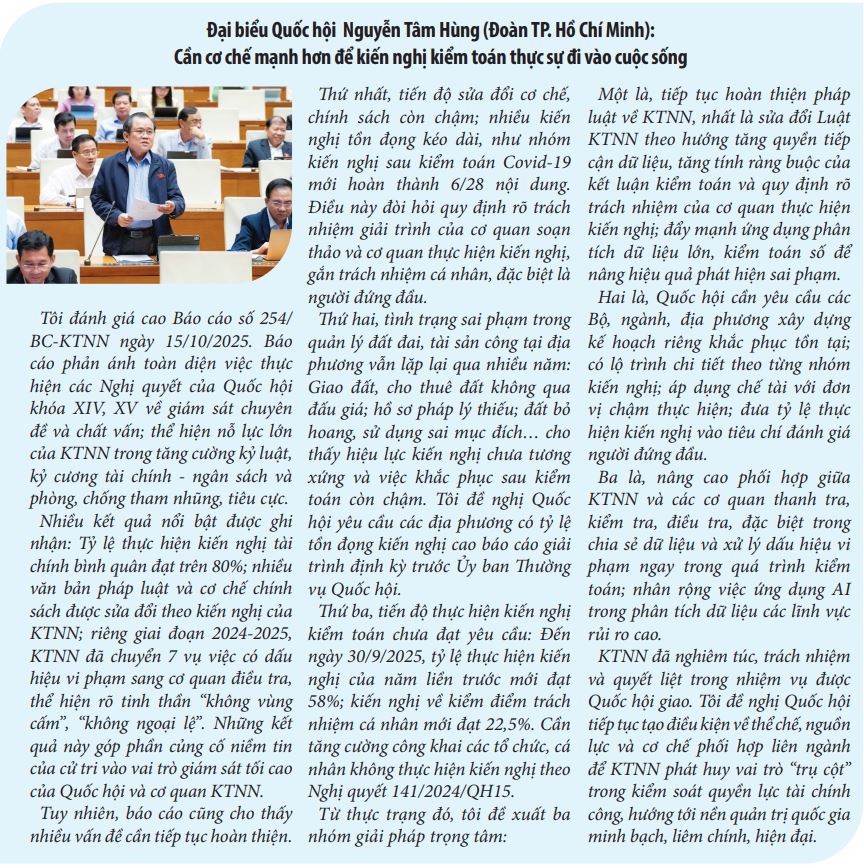 Đại biểu Nguyễn Tâm Hùng (Đoàn ĐBQH TP. Hồ Chí Minh) nhận xét: Tỷ lệ thực hiện kiến nghị tài chính của KTNN bình quân đạt trên 80%; nhiều cơ chế, chính sách được sửa đổi theo kiến nghị kiểm toán; riêng giai đoạn 2024-2025, KTNN đã chuyển 7 vụ việc có dấu hiệu vi phạm sang cơ quan điều tra. Những kết quả này góp phần củng cố niềm tin của cử tri đối với cơ quan giám sát tối cao và hệ thống kiểm toán quốc gia.