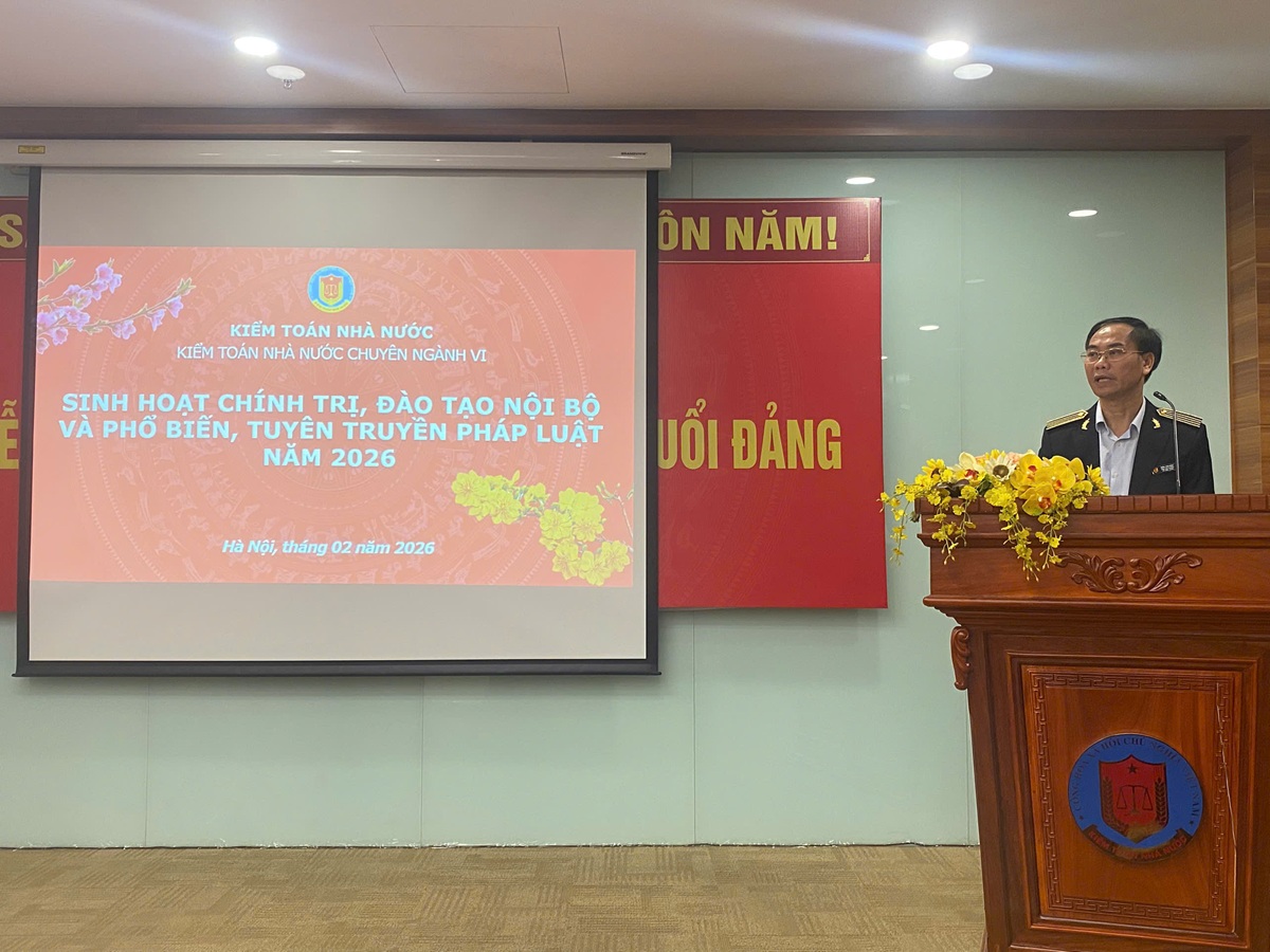 (sav.gov.vn) - Trong hai ngày 04-05/2/2026, Kiểm toán nhà nước (KTNN) chuyên ngành VI đã tổ chức sinh hoạt chính trị, đào tạo nội bộ và phổ biến, tuyên truyền pháp luật năm 2026. Tham dự và chỉ đạo Hội nghị có Bí thư Đảng uỷ, Kiểm toán trưởng KTNN chuyên ngành VI Trần Văn Hảo, các Phó Kiểm toán trưởng cùng toàn thể công chức, người lao động KTNN chuyên ngành VI.